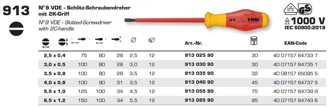 Викрутка діелектрична FELO SL 1000V 2,5х0,4x75х80 мм (91302590)