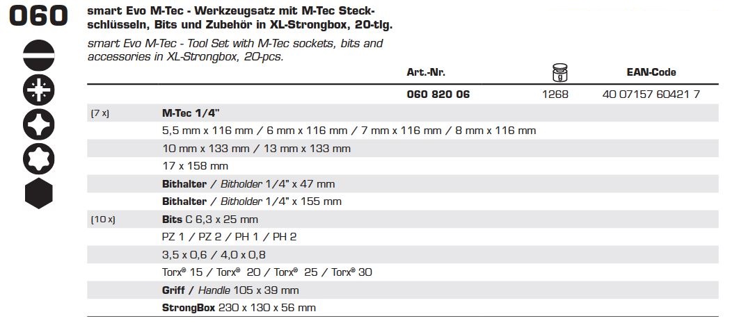 Звичайні вставки для торцевих ключів досягають межі своїх можливостей у двох ситуаціях: коли гайка розташована на кінці довгої різьби або коли гвинт чи гайку потрібно вставити у важкодоступне місце. Різноманітні головки M-TEC легко вирішують ці проблеми, оскільки вони оснащені пружинним магнітним корпусом, який надійно утримує гайку або гвинт і дозволяє встановлювати або послаблювати їх у важкодоступних місцях. Особливо практично те, що корпус магніту глибоко втискається у вставну трубку для довгих різьбових болтів і автоматично підлаштовується під довжину болта.
