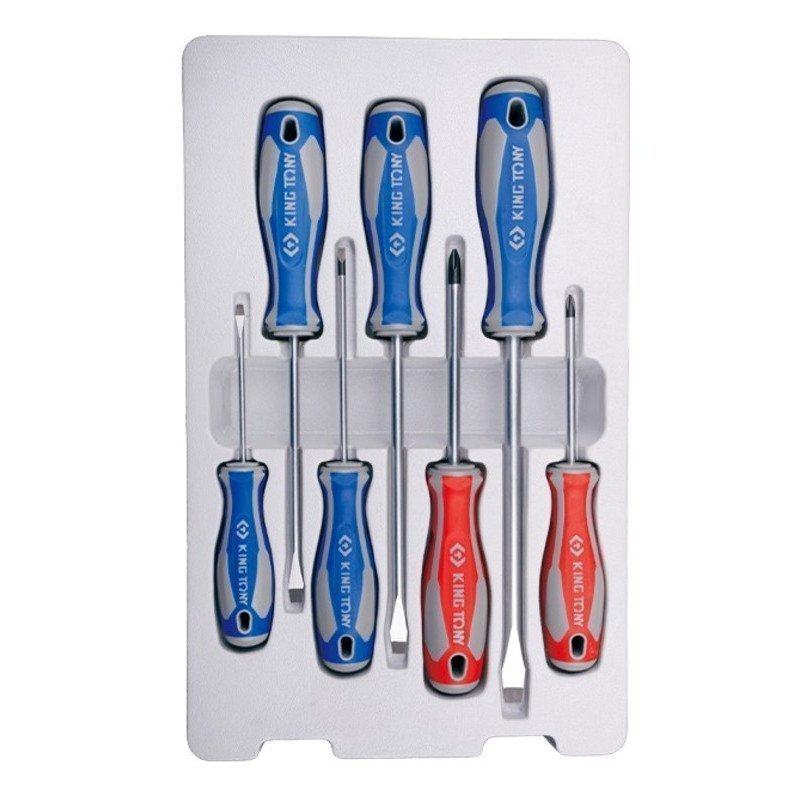 Викрутки (набір 7 ін.) Викрутка Філіпс 1421 (No.1 x 80, No.2 x 100) Викрутка шліцева 1422 (3 x 75, 4 x 100, 5.5 x 125, 6.5 x 150, 8 x 175) Набір викруток KING TONY 30117MR призначений для монтажу та демонтажу кріпильних вузлів різних виробів, пристроїв та агрегатів. Особливості набору • Високоточна обробка намагнічених наконечників дає ідеальний контакт із кріпленням. • Ергономічні двокомпонентні рукоятки PP+TPR стійкі до дії масел, бензину, кислот та лугів. • Матеріал робочої частини викруток SNCM+V – легована сталь із додаванням молібдену, покриття хром.