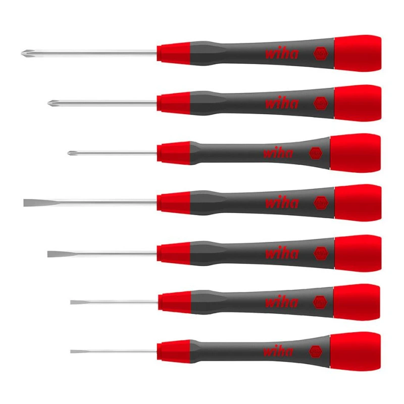 Основное требование к выполнению резьбовых соединений в точной механике заключается в том, чтобы работать выверенно и точно, не повреждая детали. Микроотвёртки Wiha PicoFinish, благодаря длинной тонкой рукоятке и крутящемуся колпачку, прекрасно подходят для выполнения точных и филигранных работ в электрике и точной механике, а также в области хобби и изготовлении моделей. Благодаря эргономичной форме рукоятки с мягкой зоной, отвёртка очень удобна в использовании. Чувствительное и быстрое вращение поддерживается легко вращающимся колпачком. Кроме того, знак на колпачке облегчает выбор правильного профиля отвёртки. В набор входят 7 микроотвёрток PicoFinish.