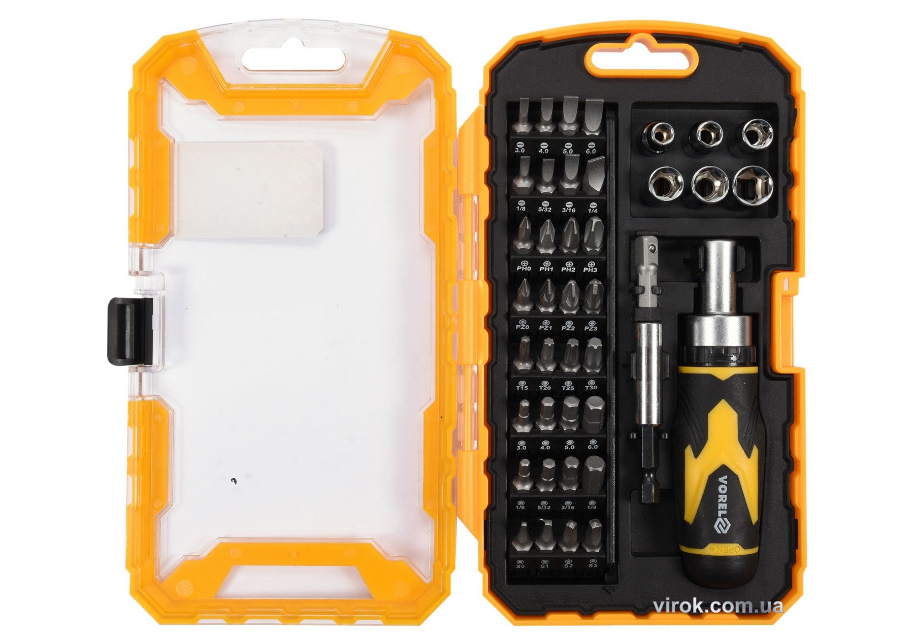 VOREL Викрутка реверсивна : Набір насадок, торцевих головок квадрат 1/4", магн. тричач 41 Елем. | 64385