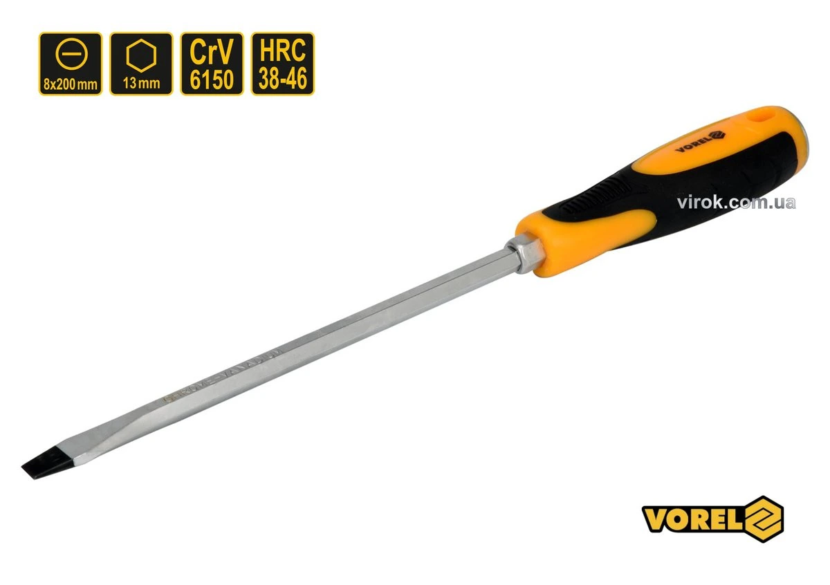 VOREL Викрутка плоска ударна з 6-гранним стержнем : SL8 х 200 мм, HRC 38-46, Cr-V | 62167