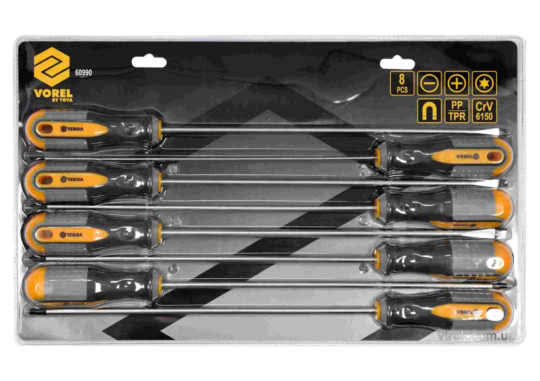 VOREL Набір викруток з подовженими стержнями : L= 325 мм, SL, PH, TORX, Cr-V, 8 шт | 60990