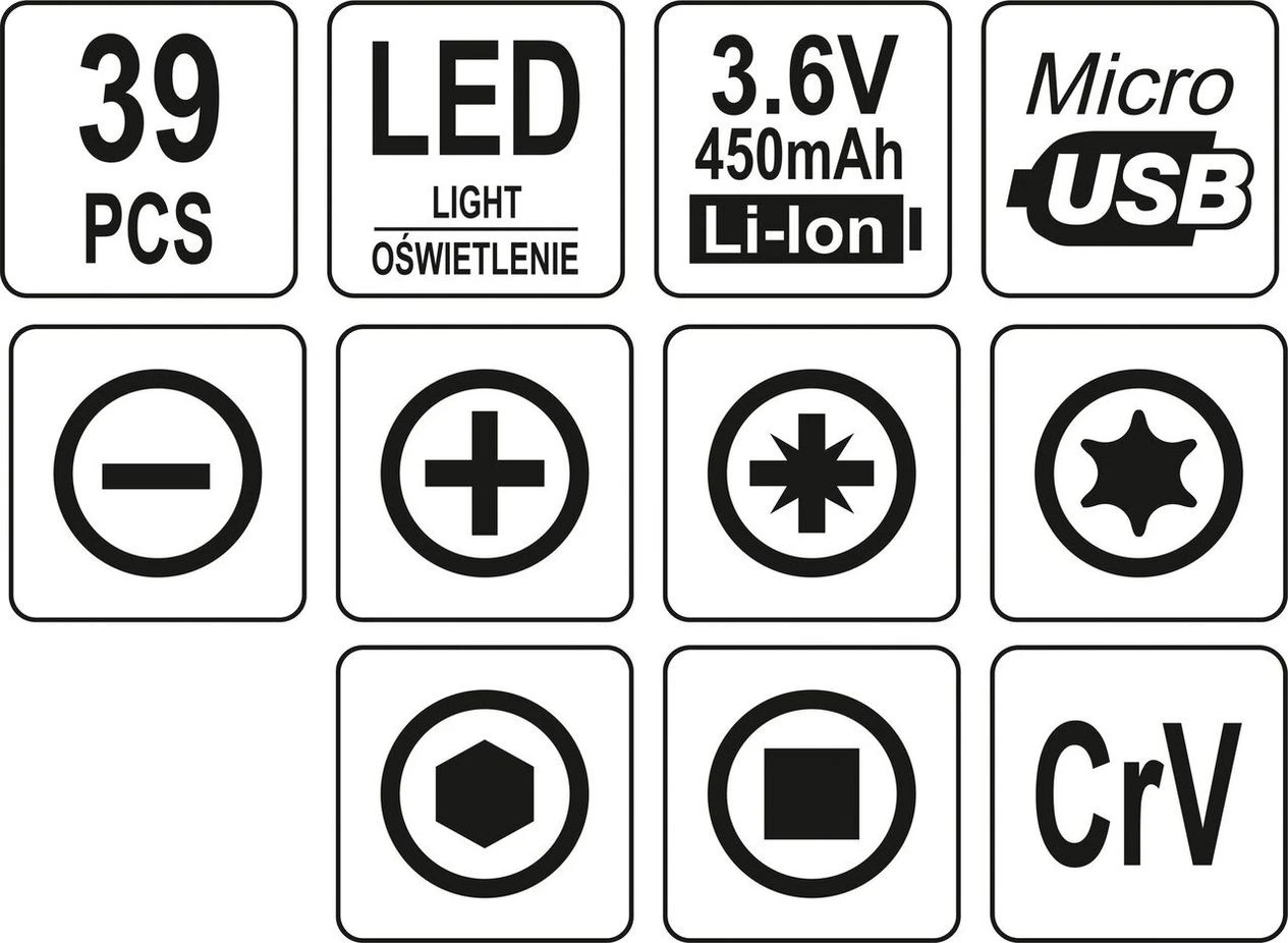 - Phillips: PH000, PH00, PH0, 2 x PH1.