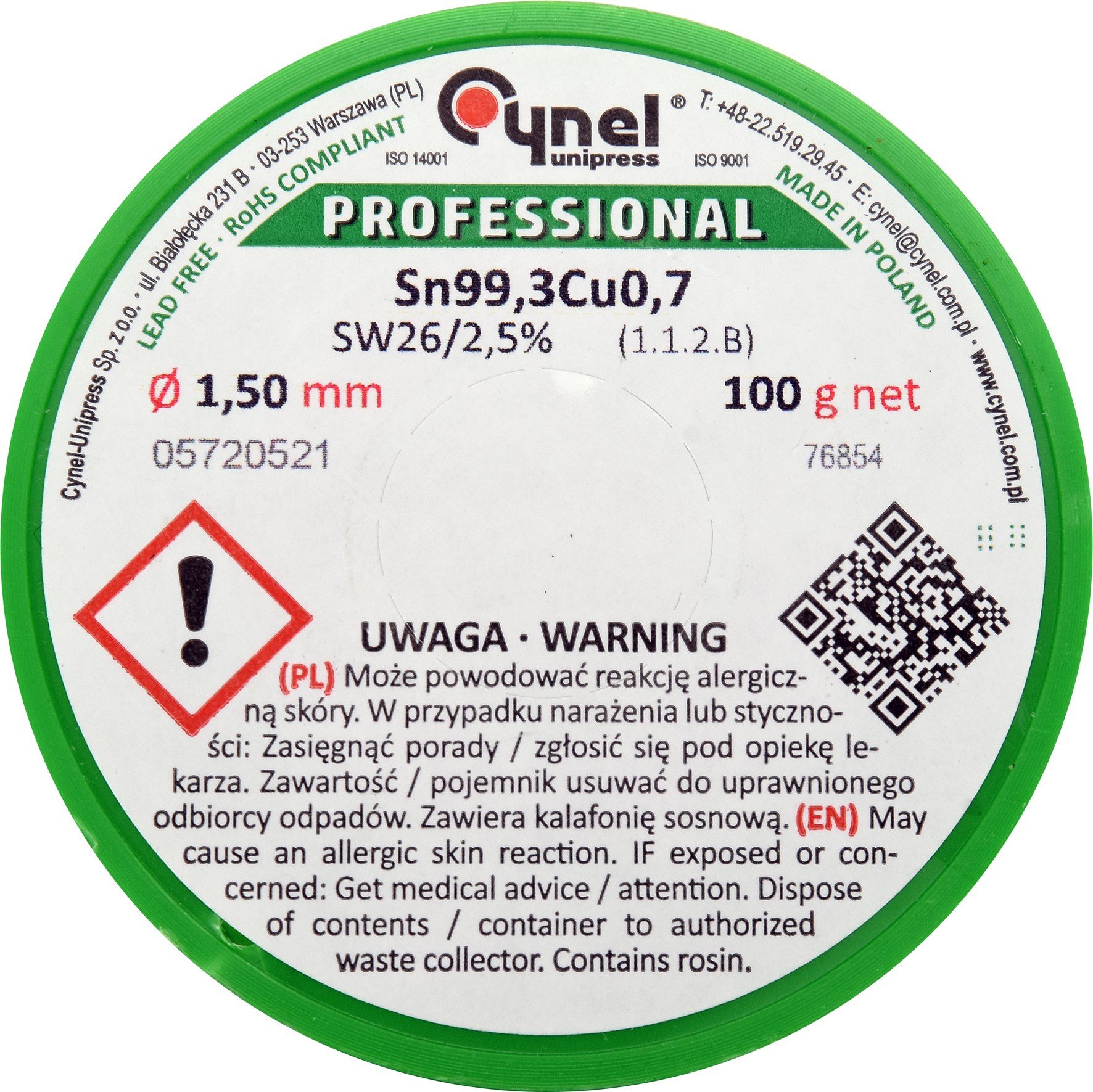 Припій без свинцю CYNEL, : Ø1,5 мм, Sn99,3-Cu0,7 дротяний на котушці з флюсом 100 г.