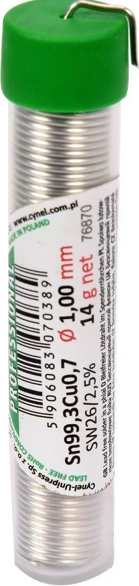VOREL Припій без свинцю CYNEL : Ø1 мм, Sn99,3-Cu0,7 дротяний в капсулі з флюсом m= 14 г | 76870