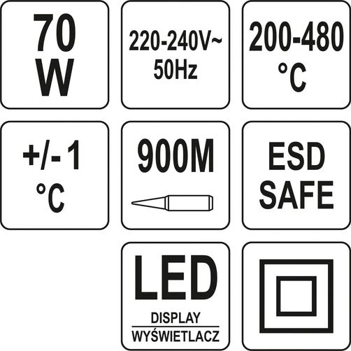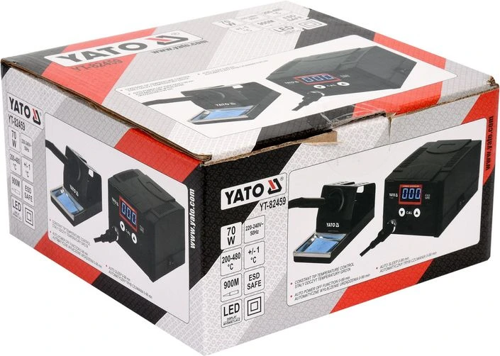 Паяльная станция YT-82459 с цифровым светодиодным дисплеем, контролем температуры и множеством функций, облегчающих правильную пайку. Станция поддерживает паяльник 908D, адаптированный к очень популярным сменным жалам серии 900M.
