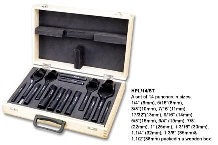 Набор из 14 пробойников в деревянном кейсе.