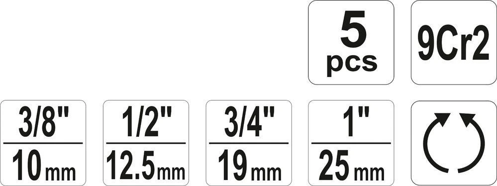 - В комплект входят 4 сменных головки, размеры: 3/8 '(10 мм), 1/2' (12,5 мм), 3/4 '(19 мм), 1' (25 мм).