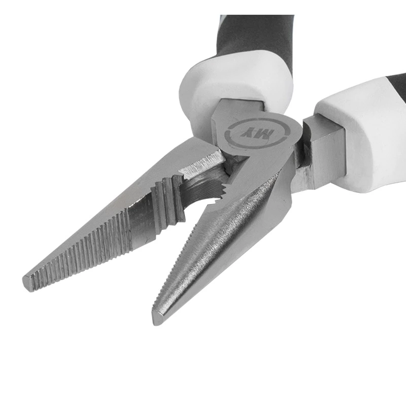 Довгогубці Soft Touch, 160мм, виготовлені з високовуглецевої інструментальної сталі. Інструмент загартовано до 55 одиниць по HRC, робочі поверхні та ріжучі частини до 60-63 одиниць. На відміну від більшості подібних інструментів має зміщену вісь шарніру, що відчутно збільшує силу стискання. Має антикорозійне нікелеве покриття металевих поверхонь. Ергономічні, зручні ручки з TPR, які не ковзають в руці та не злітають, що робить користування надійним та безпечним.