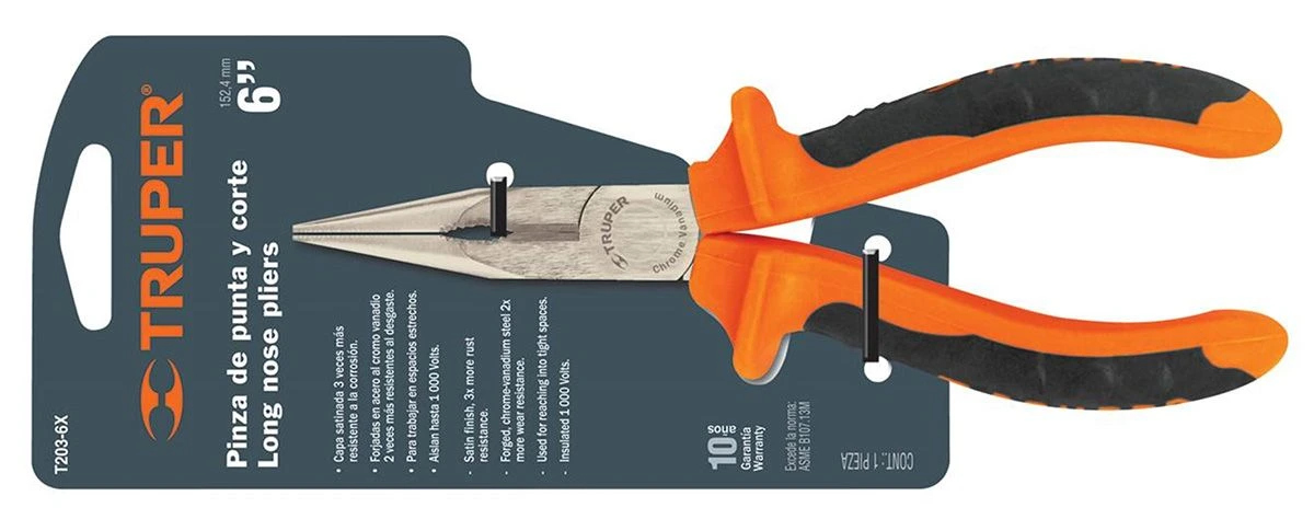 Довгогубці, Профі, прямі, діелектричні, 150мм, виготовлені з хром-ванадієвої сталі, міцнішої від звичайної вуглецевої, застосовуються при різноманітних монтажних роботах, в першу чергу електричних. За їх допомогою можна легко вигинати, скручувати, перекушувати дроти та виконувати деякі операції у вузьких, важкодоступних місцях. Діелектричний матеріал ручок здатний витримати напругу в 1000 вольт, ергономічна форма робить користування зручним та безпечним. Металеві частини мають антикорозійне покриття.