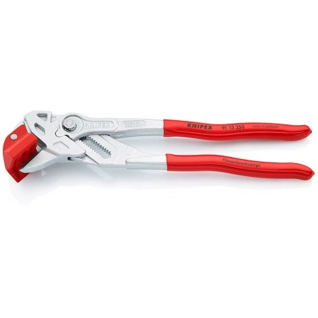 Кусачки для розламування кафельної плитки KNIPEX 91 13 250 Вага нетто 560 g Довжина загальна 250 mm Кліщі хромовані Ручки однокомпонентні для розколювання плитки з кахлю та кераміки точно за наміченою плиткорізом лінії ідеальне рішення для великих та товстих плиток оптимальний захист кахельної плитки від пошкоджень: змінні натискні губки з м'якого, стабільного пластику. висока ефективність розламування плитки завдяки 10-кратному збільшенню м'язової сили налаштування на відповідну товщину плитки простим натисканням кнопки Хромованадієва сталь, кована, загартована в маслі