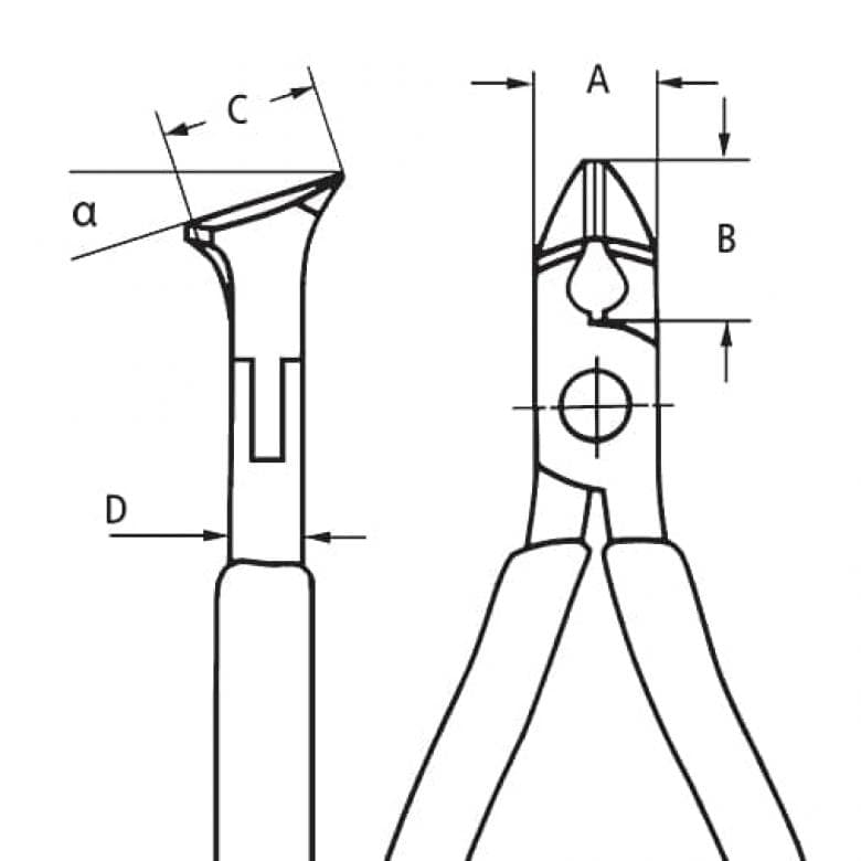62 12 120 Кусачки кутові для електроніки з ріжучими кромками для м'якого та середньотвердого дроту. Без фаски, для чистого рівного різання. Плоска пружина двоперої з малим тертям. Коробчастий прецизійний шарнір. Глянцеве полірування у поєднанні з тонкою масляною плівкою забезпечує гарний захист від корозії - і жодних порушень в електричному ланцюзі через відшаровування частинок хрому. Леза з додатковим лазерним загартуванням, твердість не менше 56 HRC. - Параметри різання/м'який дріт (діаметр): Ø 0,3 / 1,0mm - Параметри різання / дріт середньої твердості (діаметр): Ø 0,7mm - : 10mm - : 7,5mm - Довжина різака в мм (C): 17mm - Ширина головки (A): 11mm