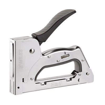 Степлер Miles TS-5600N/C - Неразборный корпус из прочных стальных деталей. Металлическая рукоятка с двухкомпонентным резино-пластиковым покрытием. Имеет стильный дизайн без съемных частей. Оснащен удобным механизмом для быстрой замены скоб, штифтов и гвоздей, а также окошком-индикатором для контроля их остатка в обойме. В конструкции степлера применен механизм регулировки силы удара. Ручка степлера имеет предохранитель для удобства и безопасности пользователя. Производитель гарантирует минимум 100000 ударов механизма.