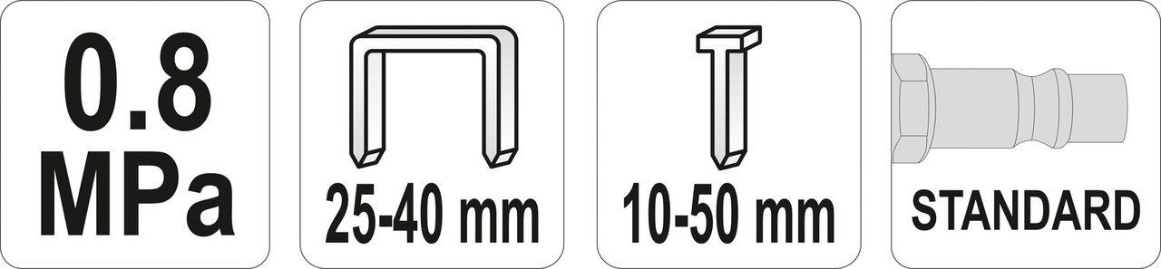 YATO Степлер пневматичний : P= 8 Bar, для скоб h= 25-40 мм, w= 5,7 мм і цвяхів h= 10-50 мм