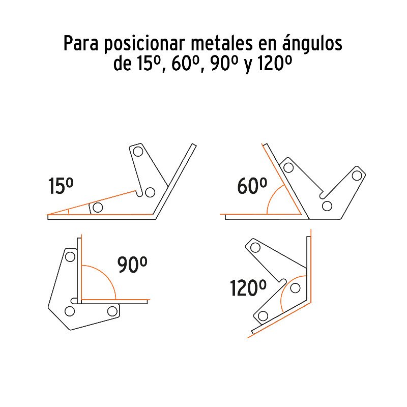 Магнітні кутники дозволяють фіксувати метали під кутами 15°, 60°, 90° і 120°, а їх конструкція дозволяє утримувати деталі ззовні та залишає достатньо вільного простору для виконання внутрішніх зварювальних робіт.