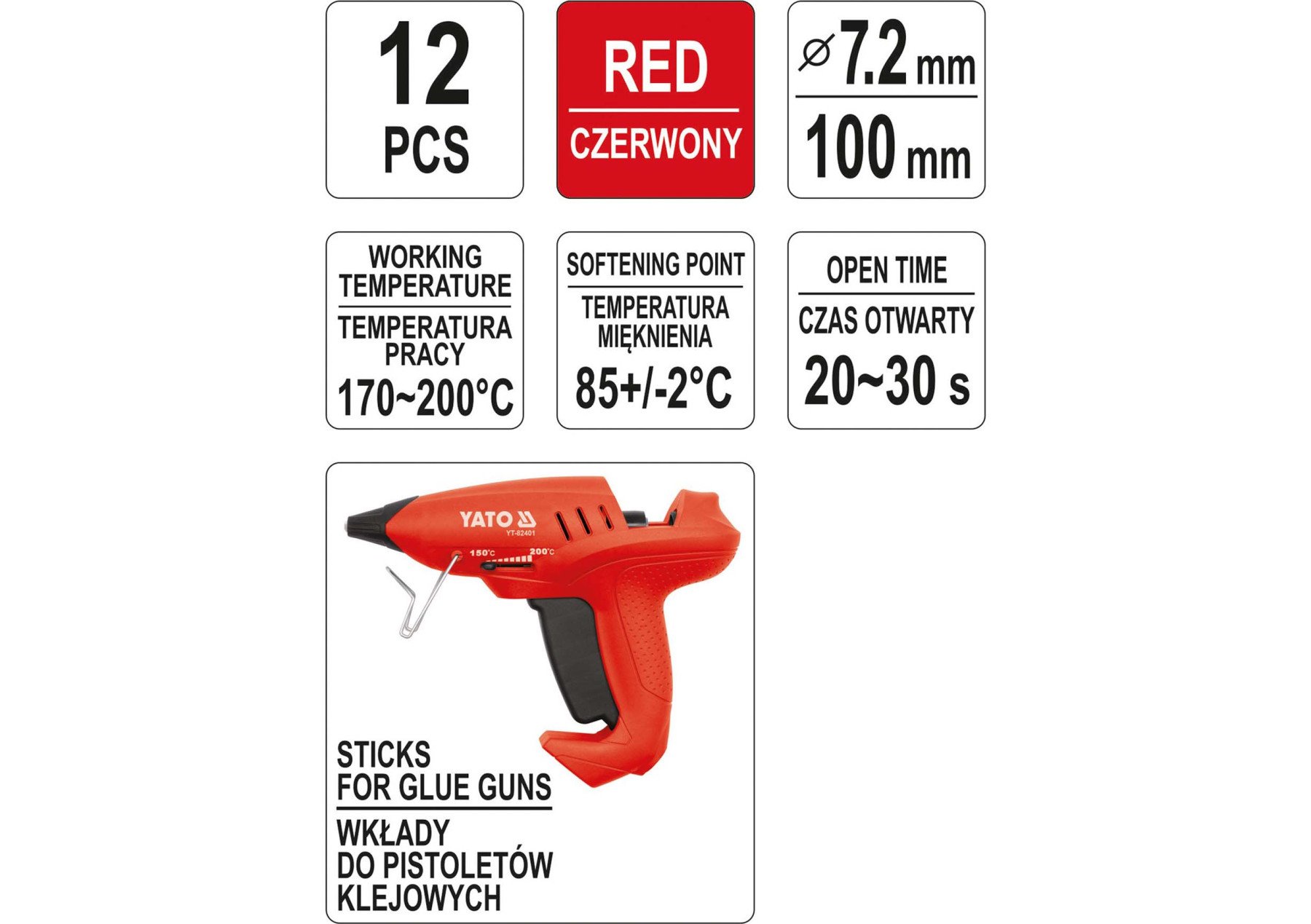 СТЕРЖНІ КЛЕЙОВІ ЧЕРВОНІ YATO 7.2 Х 100 ММ 12 ШТ
