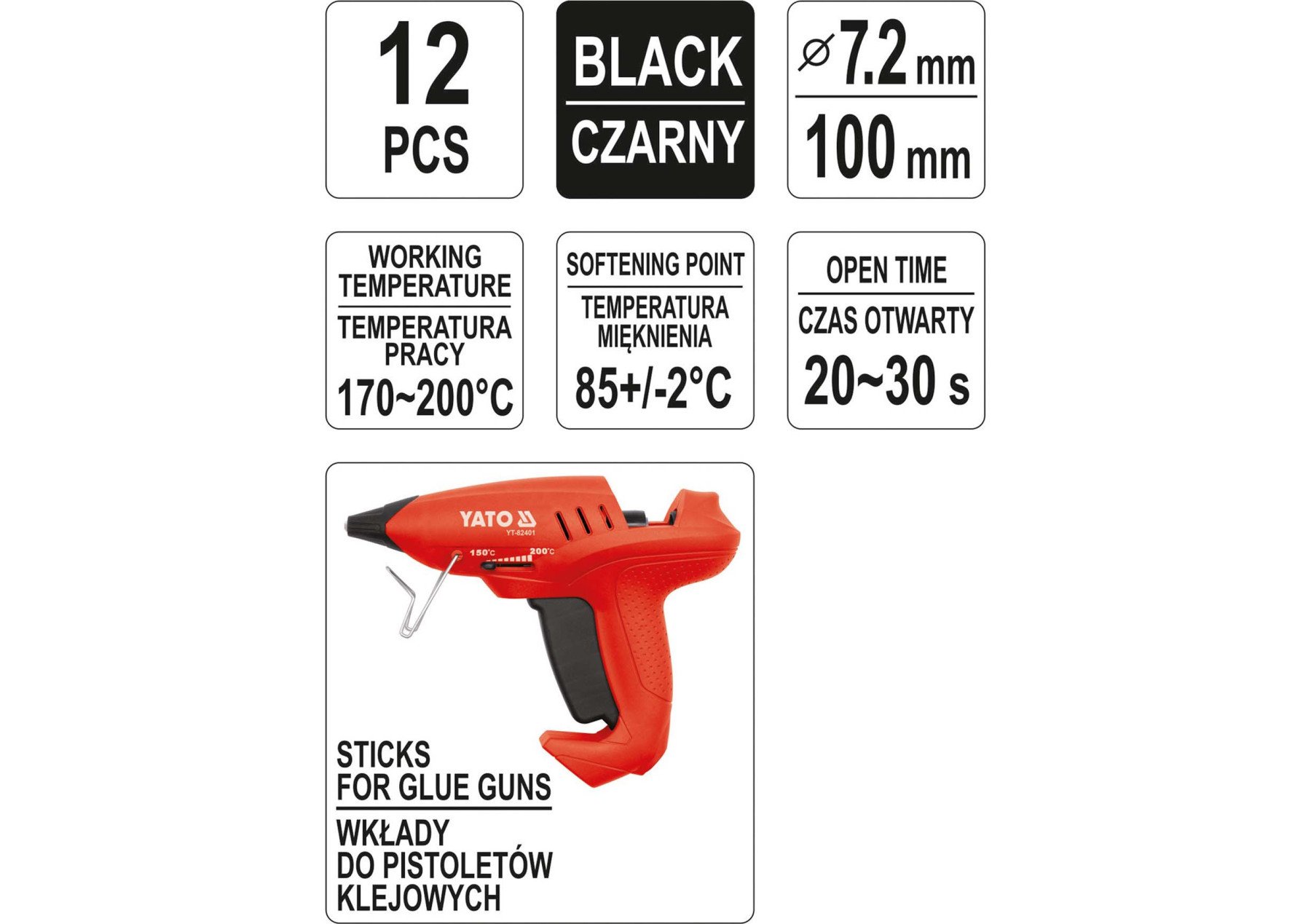 СТЕРЖНІ КЛЕЙОВІ ЧОРНІ YATO 7.2 Х 100 ММ 12 ШТ