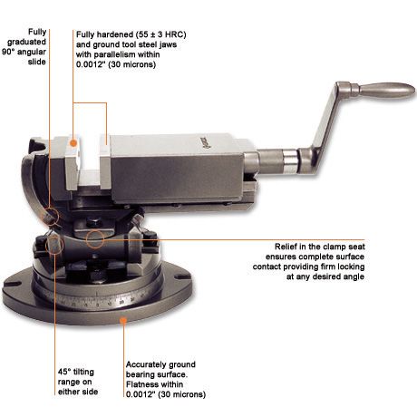 - Тиски имеют две наклонных плоскости, позволяющих установить обрабатываемую деталь под требуемым углом: пределы наклона в обе стороны ― под углом 45° и вертикальное дискретное позиционирование ― под углом 90°.