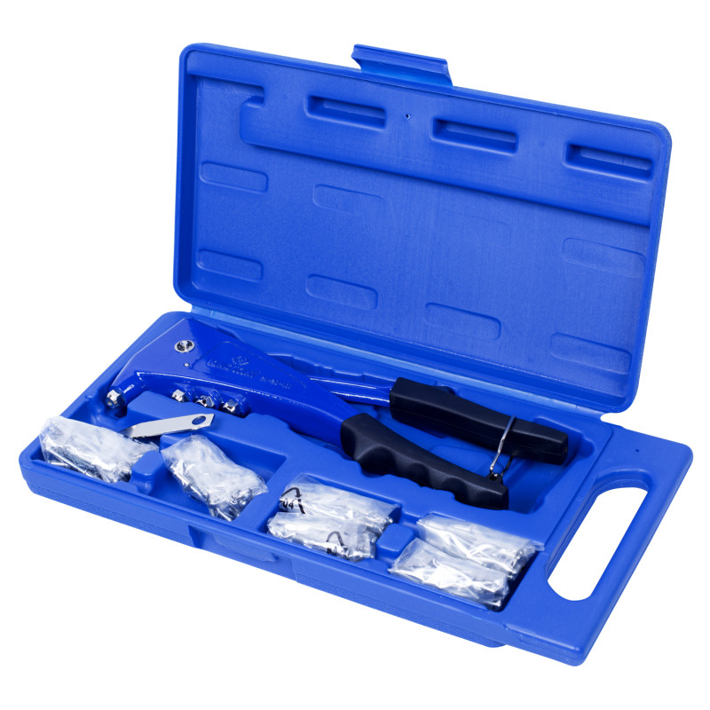 Заклепочник для потаємних заклепок Ø 2.4, 3.2, 4.0, 4.8 мм матеріал заклепок: алюміній 21-20-101 довжина 260 мм Призначення З'єднання листового металу, деталей конструкцій, а також виконання монтажних робіт різного характеру. Як сполучні елементи застосовуються потаємні заклепки витяжного типу. Галузь застосування Станції технічного обслуговування автомобілів (СТО), автосервіси, автомайстерні, промисловість, виробництво, побутове використання. Особливості Заклепочник оснащений затискними губками з твердосплавної сталі, адаптерами для заклепок різного діаметру та спеціальним ключем. Тип заклепочника: стандартний Матеріали: алюміній, сталь, твердосплавна сталь, гумопластик Упаковка: блістер Габарити упаковки: 260 х 80 х 30 мм Вага: 0,58 кг