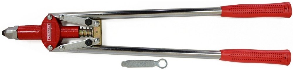 Заклепник металевий, корпус виготовлений зі сталі та має антикорозійне хромове захисне покриття. До комплекту входять 3 змінні головки під заклепки 3,2 мм, 4 мм, 4,8 мм та ключ для швидкої зміни головок. Зручні прогумовані ручки. Видовжена головка полегшує роботу у заглибленнях. Заклепник застосовується з алюмінієвими заклепками для скріплення листів металу, пластику, фанери та інших матеріалів. Використовується для невеликих і легких складальних робіт. З його допомогою можна швидко і міцно з'єднати деталі в домашніх умовах без допомоги професіоналів. Завдяки традиційній формі та матеріалам, зручний та надійний інструмент.