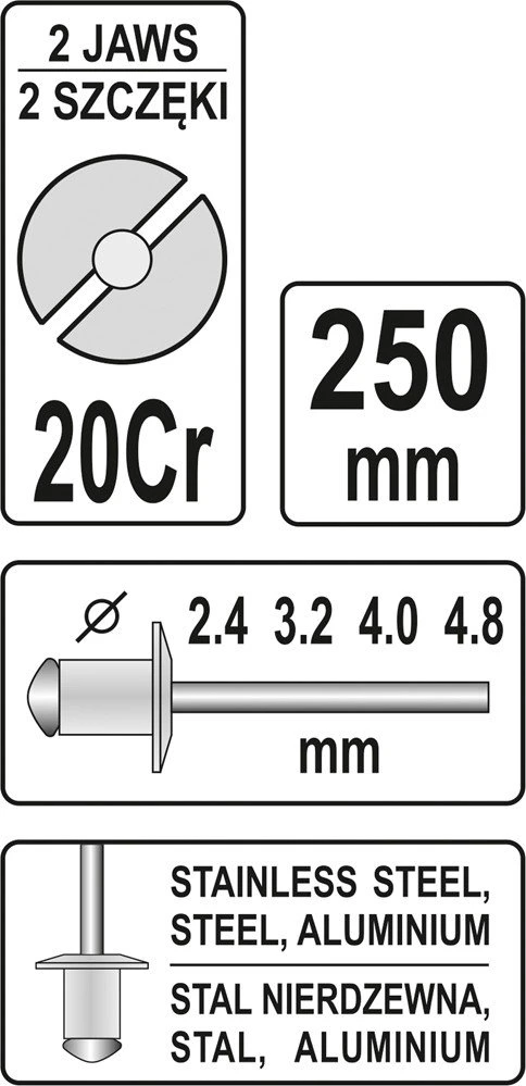 Заклепочник ручний YATO для нітів Ø= 2,4; 3,2; 4,0; 4,8 мм, l= 250 мм [6/24]