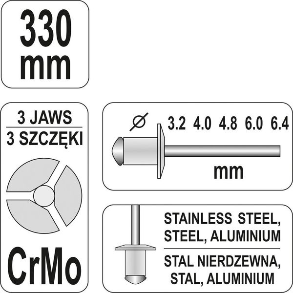 Заклепочник дворучний YATO для заклепок Ø= 3,2; 4; 4,8; 6; 6,4 мм, l= 330 мм [16]