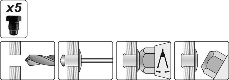 В комплекті: 5 заклепок діаметром 3.2, 4, 4.8, 6, 6.4 мм.