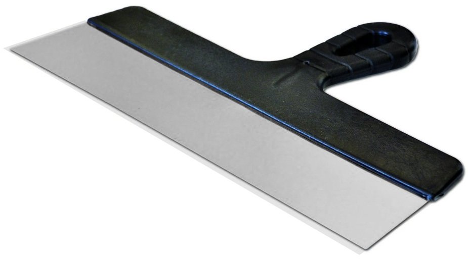 Шпатель с пластмассовой ручкой имеет лезвие, которое изготовлено ??из нержавеющей стали. Шпатель имеет удобную пластмассовую ручку с отверстием для подвешивания. Шпатель служит для проведения штукатурных работ для нанесения, распределения и выравнивания шпаклевочных смесей при отделочных работах. Шпатель имеет ширину от 150 мм до 600 мм. Шпатель с шириной от 350 мм до 600 мм используется для фасадных работ. Шпатель используются при проведении штукатурных работ для нанесения, распределения и разравнивания строительных смесей по обрабатываемой поверхности во время проведения строительных работ.