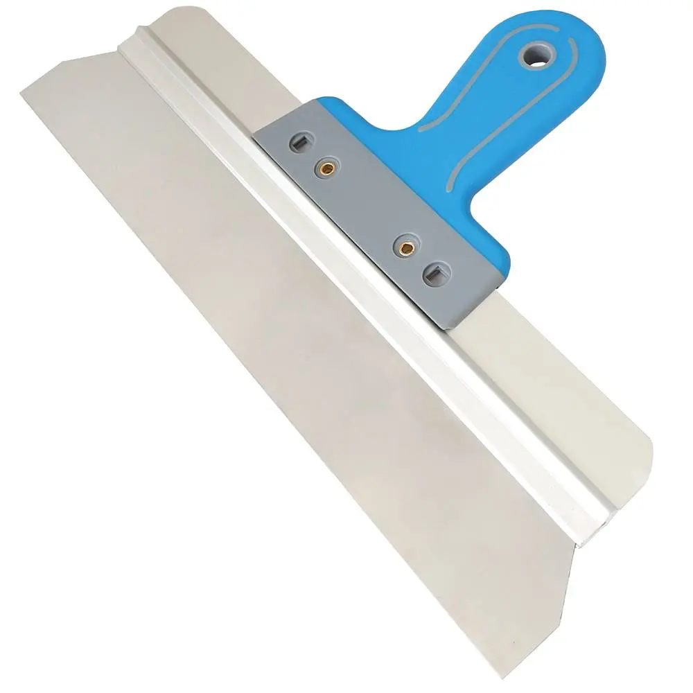 Шпатель фасадный имеет лезвие, которое изготовлено из полированного стального полотна с нержавеющим покрытием. Шпатель имеет удобную двухкомпонентную ручку с отверстием для подвешивания. Лезвие надежно закреплено в алюминиевом профиле заклепками. Шпатель служит для проведения штукатурных работ для нанесения распределения и выравнивания штукатурных и шпаклевочных смесей при фасадных отделочных работах. Шпатель имеет ширину от 150 мм до 600 мм. Шпатель используются при проведении штукатурных работ для нанесения, распределения и разравнивания строительных смесей по обрабатываемой поверхности при проведении фасадных строительных работ.