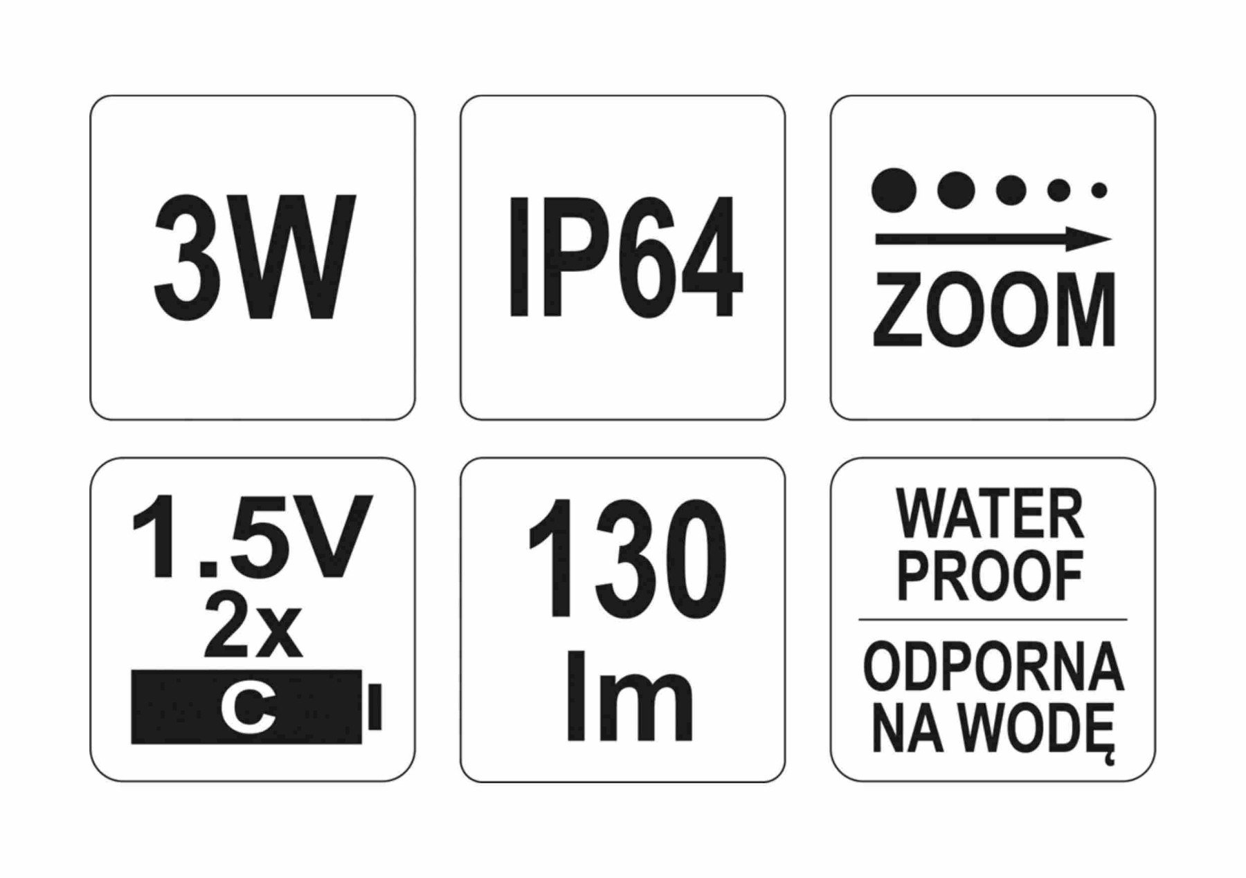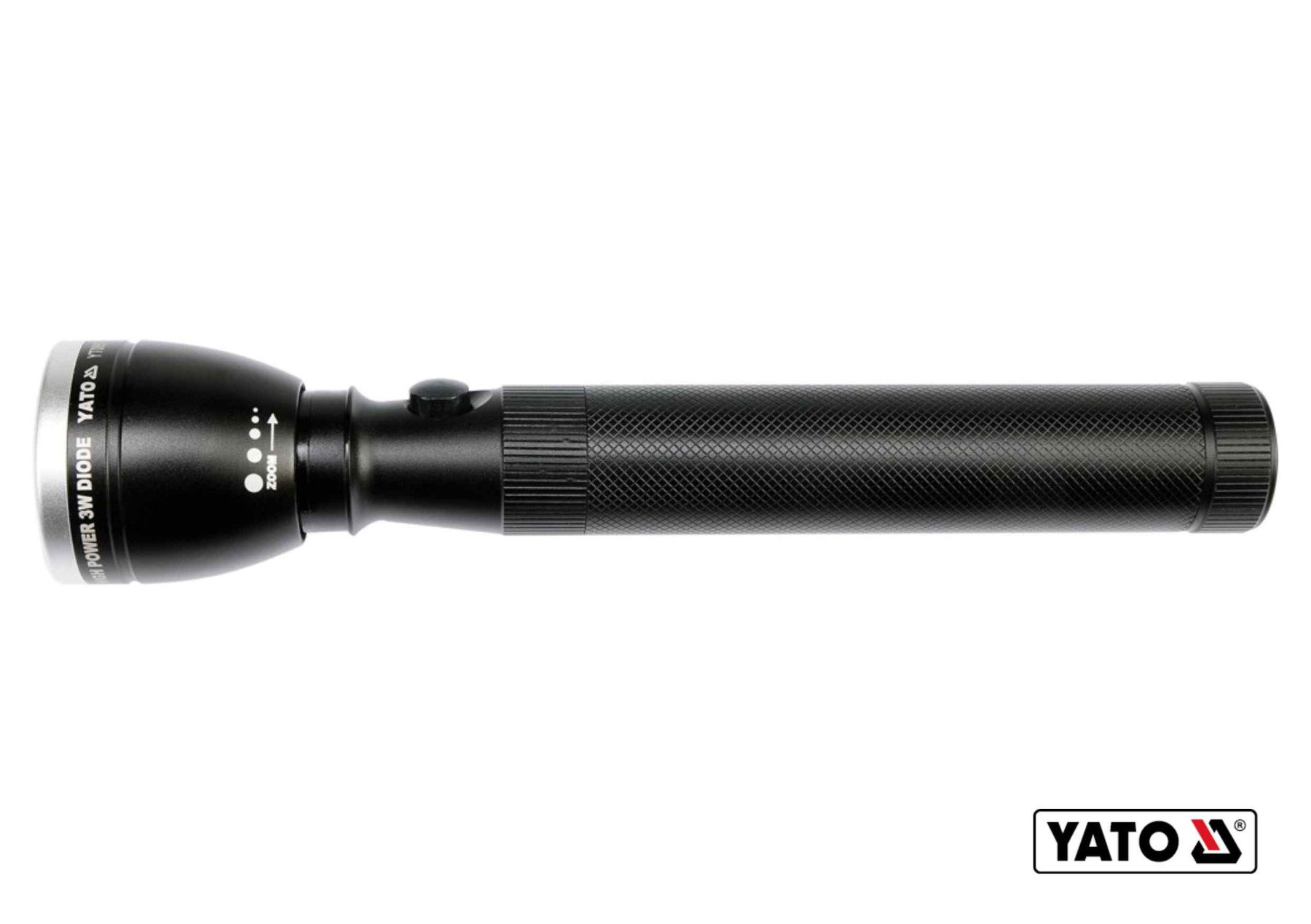 YATO Ліхтар діодний 3 Вт на батарейки 2 x R14 (2xC) і 3 режими світла; 228х 47 мм, водонепроникний, чохол