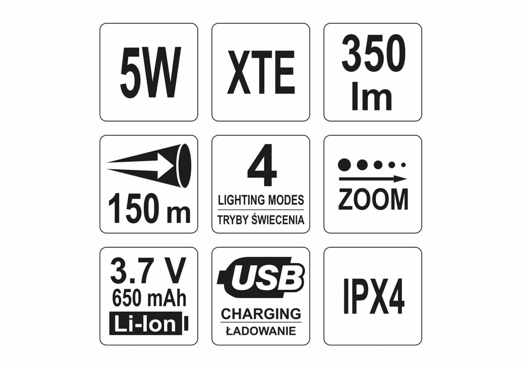 YATO Ліхтар світлодіодний (XTE CREE), акумулят. Li-Ion 650 мА, Р= 5 Вт, Ф= 350 lm. Ø= 27 мм x 94 мм