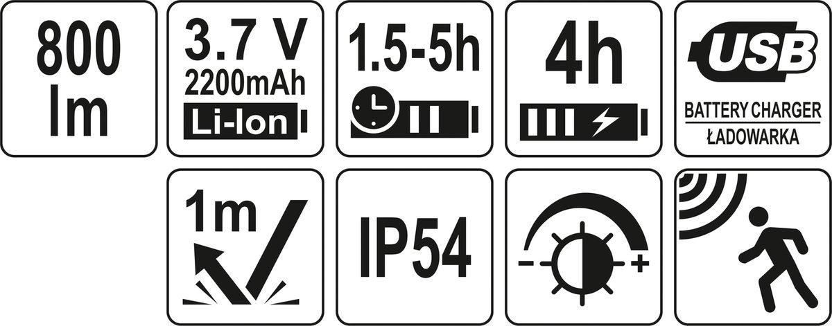 IP54 - захист від доступу до небезпечних частин дротом і захист від пилу і захист від бризок води з будь-якого напрямкуДуже потужний і функціональний налобний ліхтарик Yato з плавним регулюванням світла до 800 лм . Чотири режими дозволяють регулювати освітлення відповідно до ваших занять і рівня заряду акумулятора. Вбудований датчик руху дозволяє вмикати і вимикати світло помахом руки. Крім того, налобні ліхтарі мають ряд зручностей – регулювання кута нахилу, від’єднання від ременя , магнітна основа та індикатор заряду батареї. Налобний ліхтар працює від ємної літій-іонної акумуляторної батареї, яка забезпечує від 1,5 до 5 годин роботи.