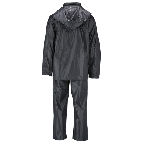 Двокомпонентний плащ від Vorel. Куртка з двома великими кишенями та регульованим капюшоном, штани з еластичним поясом та розрізами з боків, через які можна дістатися до кишень штанів.