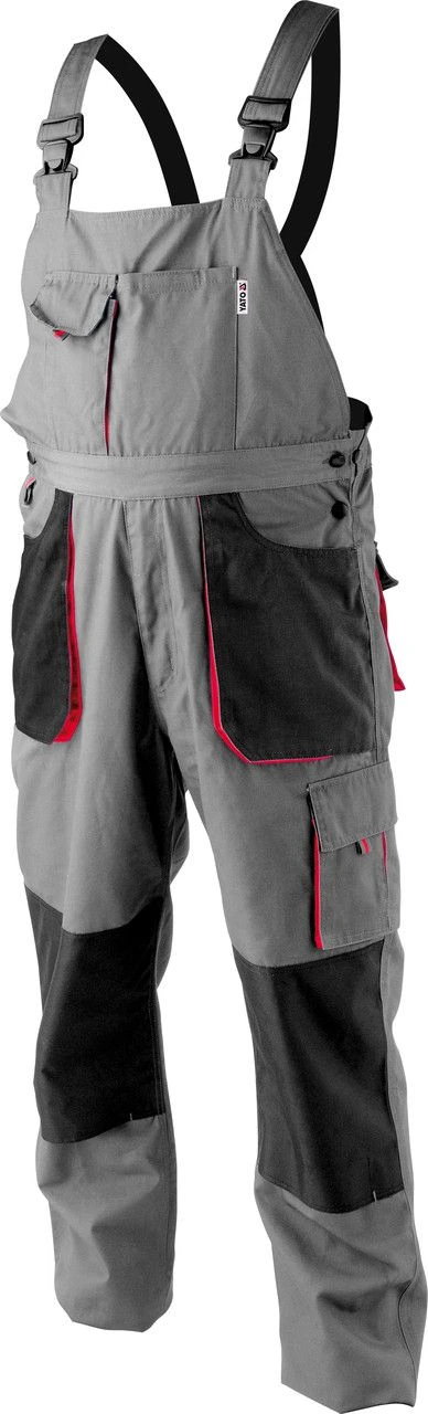 Рабочие брюки на подтяжках из плотного прочного материала на основе хлопка и полиэстера. Серый цвет с черной и красной фурнитурой. У них есть четыре больших накладных кармана, два спереди и два сзади, а также специальный карман для мобильного телефона на ноге. На передних штанинах нашитые полиэфирные подкладки для размещения наколенников. На груди клапан с двумя карманами и регулируемым креплением для ремня безопасности.