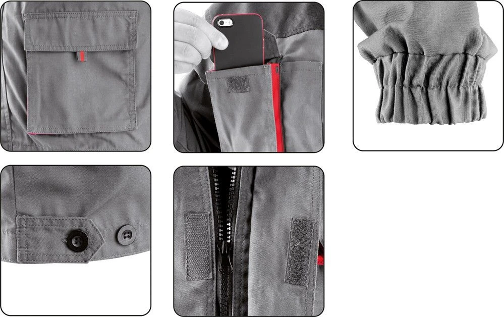 Рабочая кофточка застегивается на молнию, застегивается на клапан на липучке. Изготовлен из плотного прочного материала на основе хлопка и полиэстера (35% и 65%). Серый цвет с черной и красной фурнитурой. Он имеет четыре внешних накладных кармана с клапанами на липучках, в том числе один, адаптированный для мобильного телефона. Манжеты на резинке на завязках, регулировка ширины внизу кнопками. На плечах нашиты усиления из полиэстера. Дизайн в соответствии с современными тенденциями.
