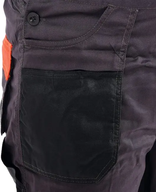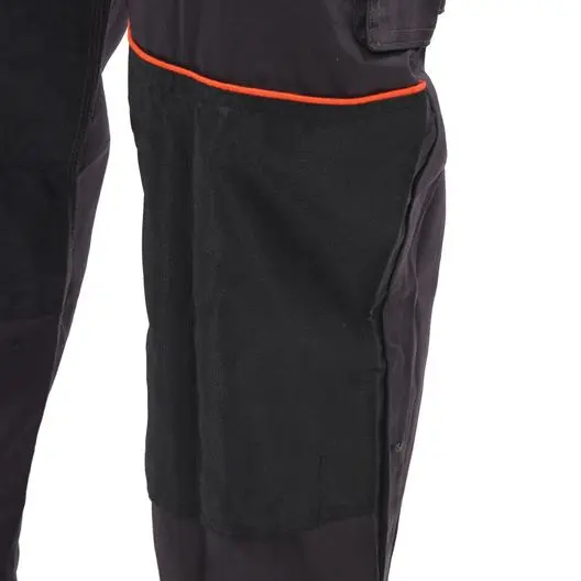 Рабочие брюки с подтяжками, размер L, изготовлены из толстого, износостойкого материала на основе хлопка и полиэстера / 35% и 65% /. Черный с красными добавлениями. У них есть четыре больших накладных кармана, два спереди и два сзади, а также специальный карман для мобильного телефона на ноге. Спереди, на ногах сшито подкрепление из полиэфирной ткани для размещения наколенников. Клапан на груди с двумя карманами и регулируемым креплением подтяжек.