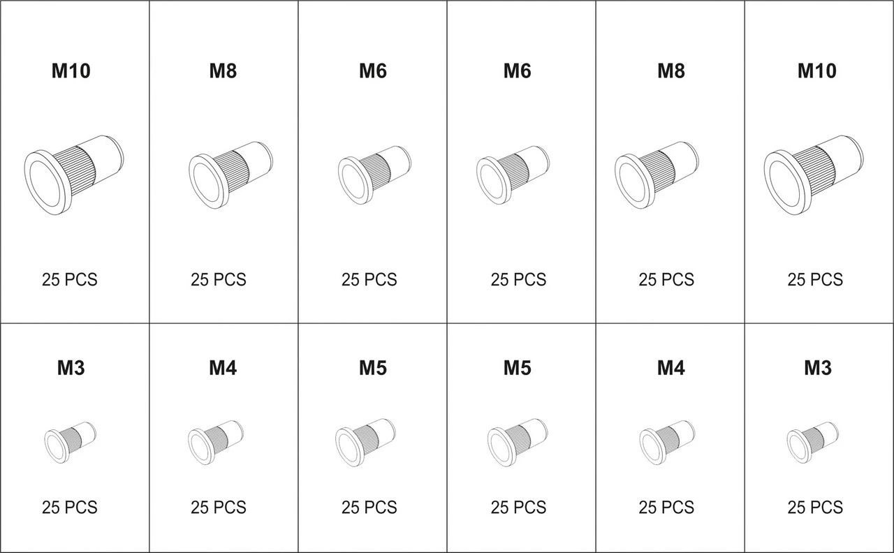 - Сталь: M3-25 шт., M4-25 шт., M5-25 шт., M6-25 шт., M8-25 шт., M10-25 шт.