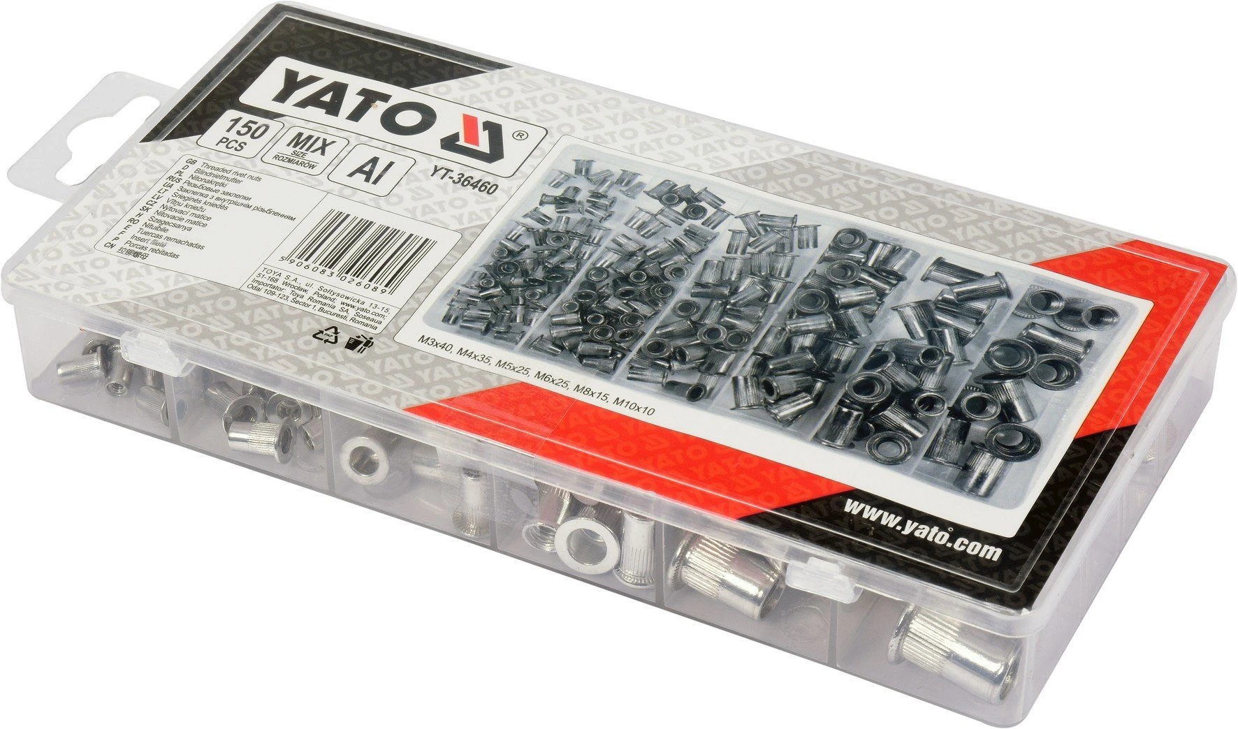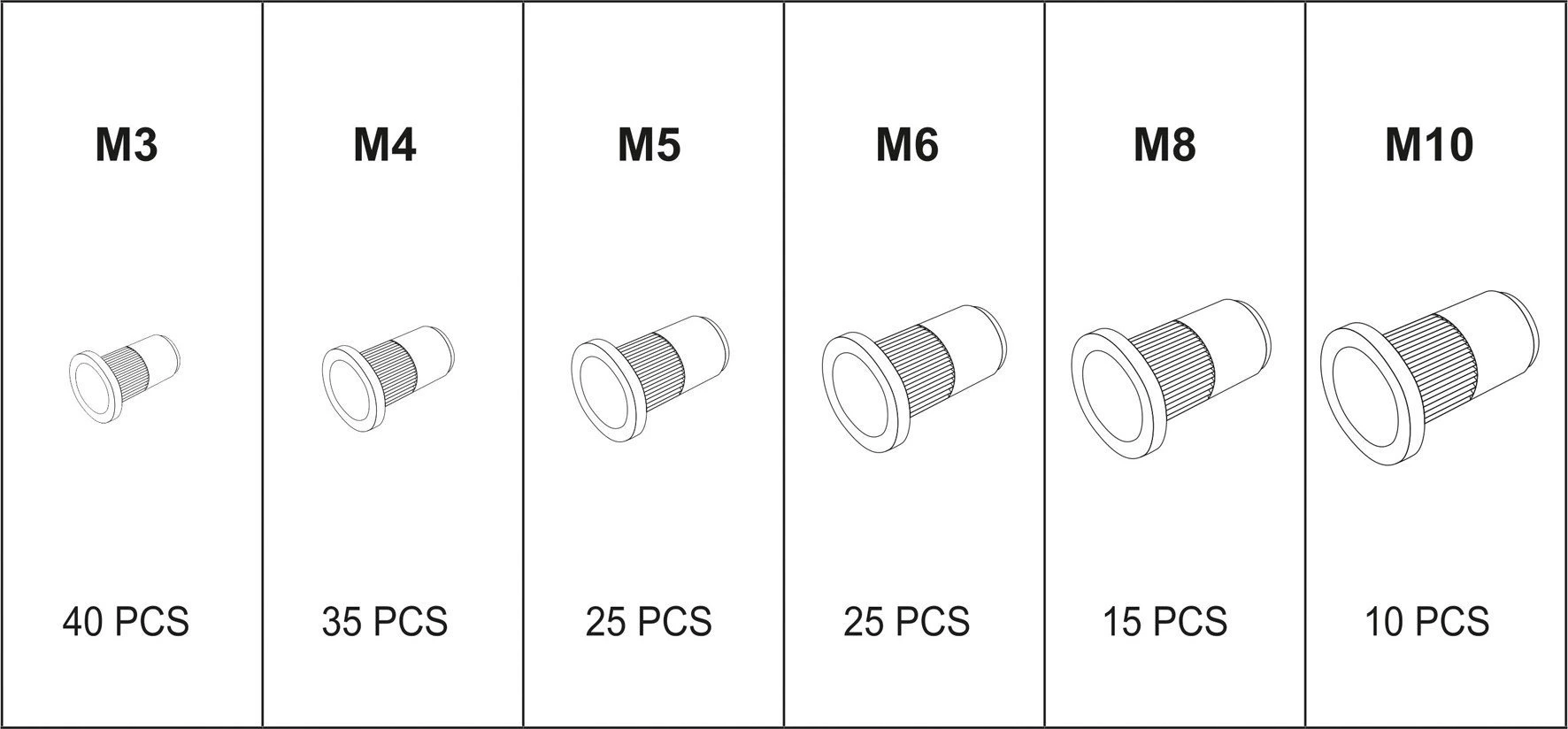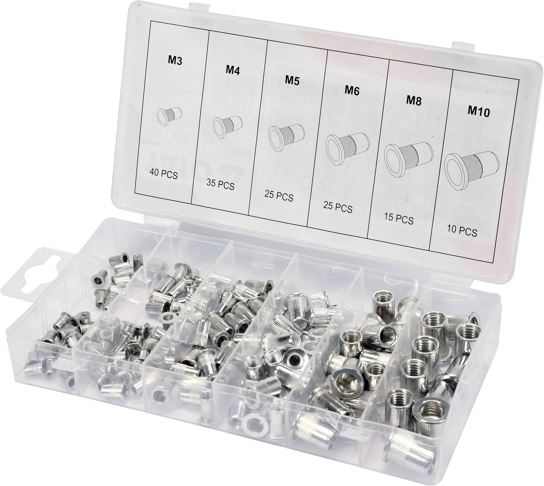 M3- 40 SZT., M4-35 SZT., M5- 25 SZT., M6- 25 SZT., M8-15 SZT., M10-10 SZTПараметры Материал / покрытие Алюминий Диаметр, мм 3 Головка. Плоская -