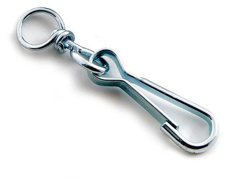 Карабін з вертлюгом, виготовлений з вуглецевої сталі із захисним цинковим покриттям, призначений для захоплення і міцної фіксації ланки ланцюга або ременя на низьких навантаженнях. Не використовується для підйому. Часто застосовується в домашньому господарстві. Розмір виробу визначається за довжиною карабіну.