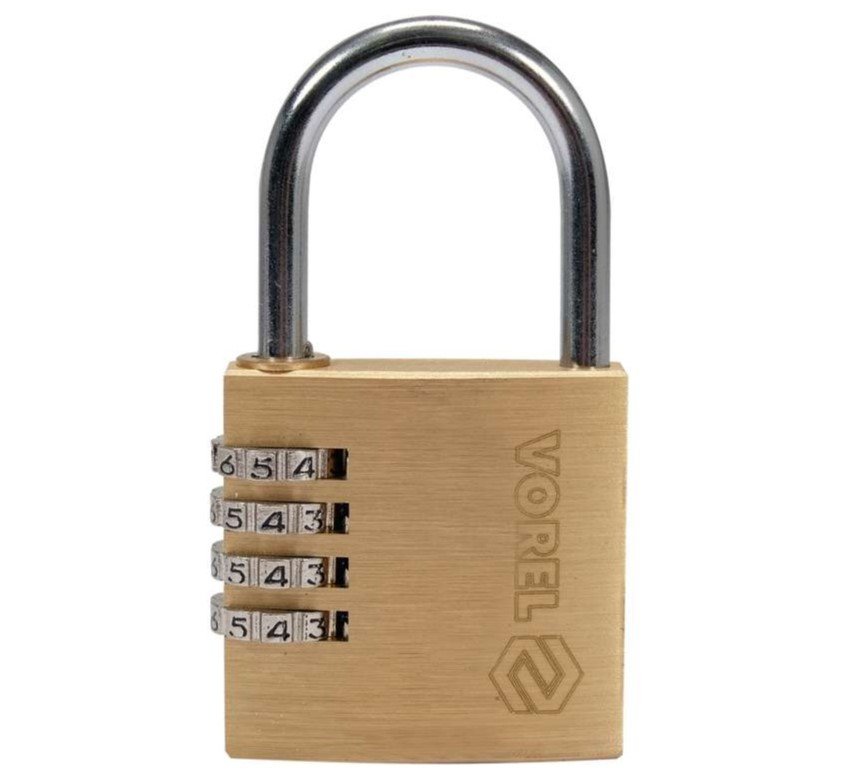 VOREL Замок навісний з кодовим замиканням : латунний корпус- 40х 11,8х39,5 мм, стал дуга- 30х25х 5 мм | 77608