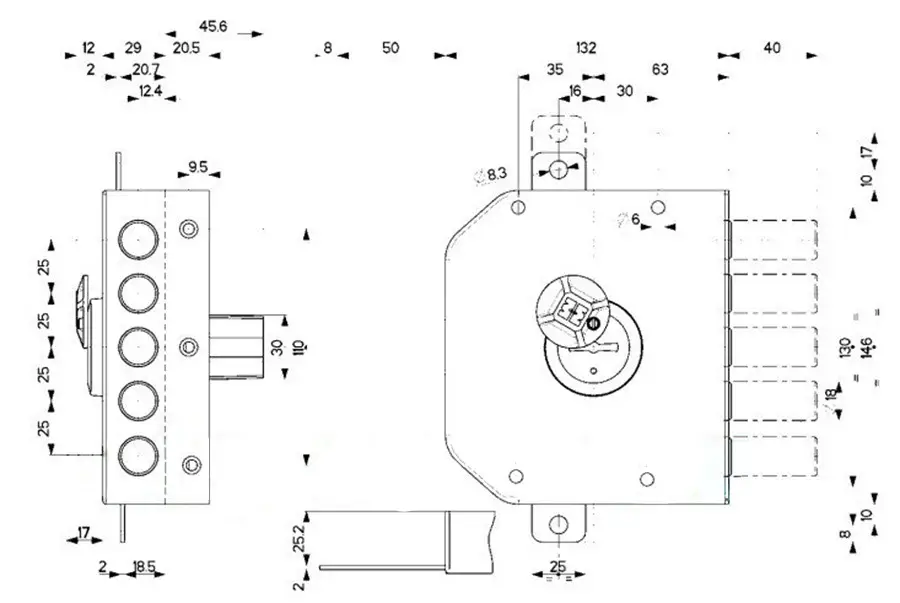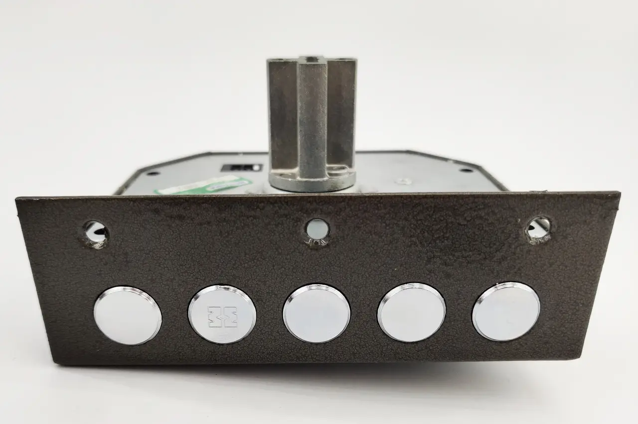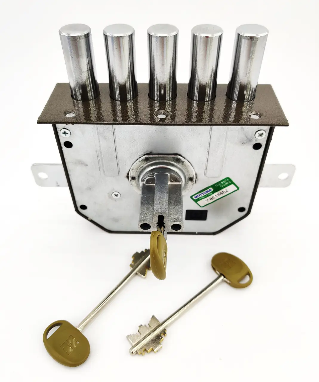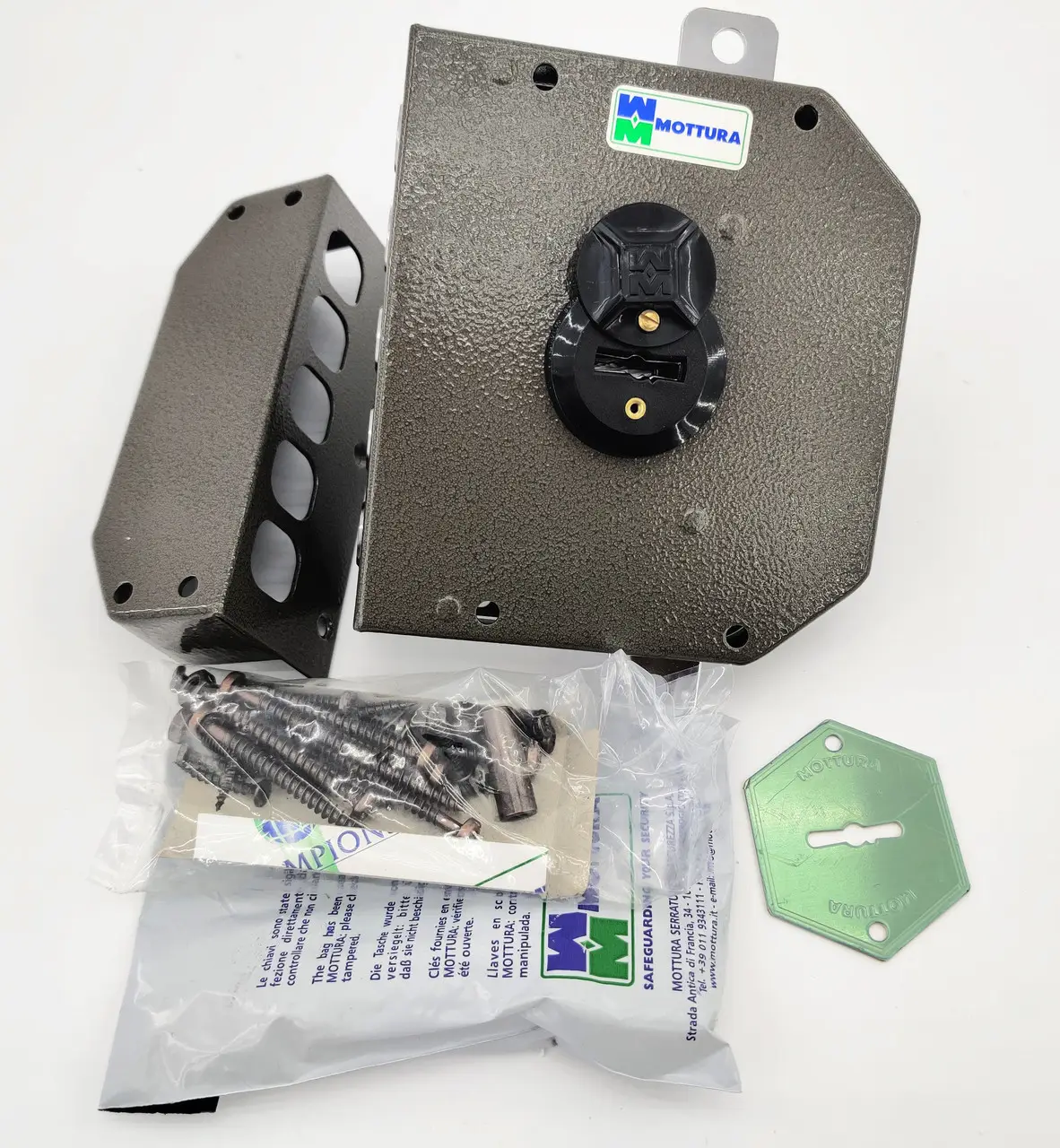 Основні атрибути Виробник Mottura Країна виробник Італія Застосування замку Металеві двері, Дерев'яні двері, Захисна конструкція, Ворота Тип встановлення замку Накладної Відкриття блоку Ліве Механізм секретності Сувальдний Кількість ригелів 4 Форма ригеля Циліндрична Діаметр ригеля 18 мм Вихід ригеля 40 мм Стан Новий Комплектація Корпус замку Так Кількість ключів 5 Відповідна планка 1 Зовнішня декоративна накладка 1 Кріпильний комплект Так Інструкція по установці/експлуатації Так -