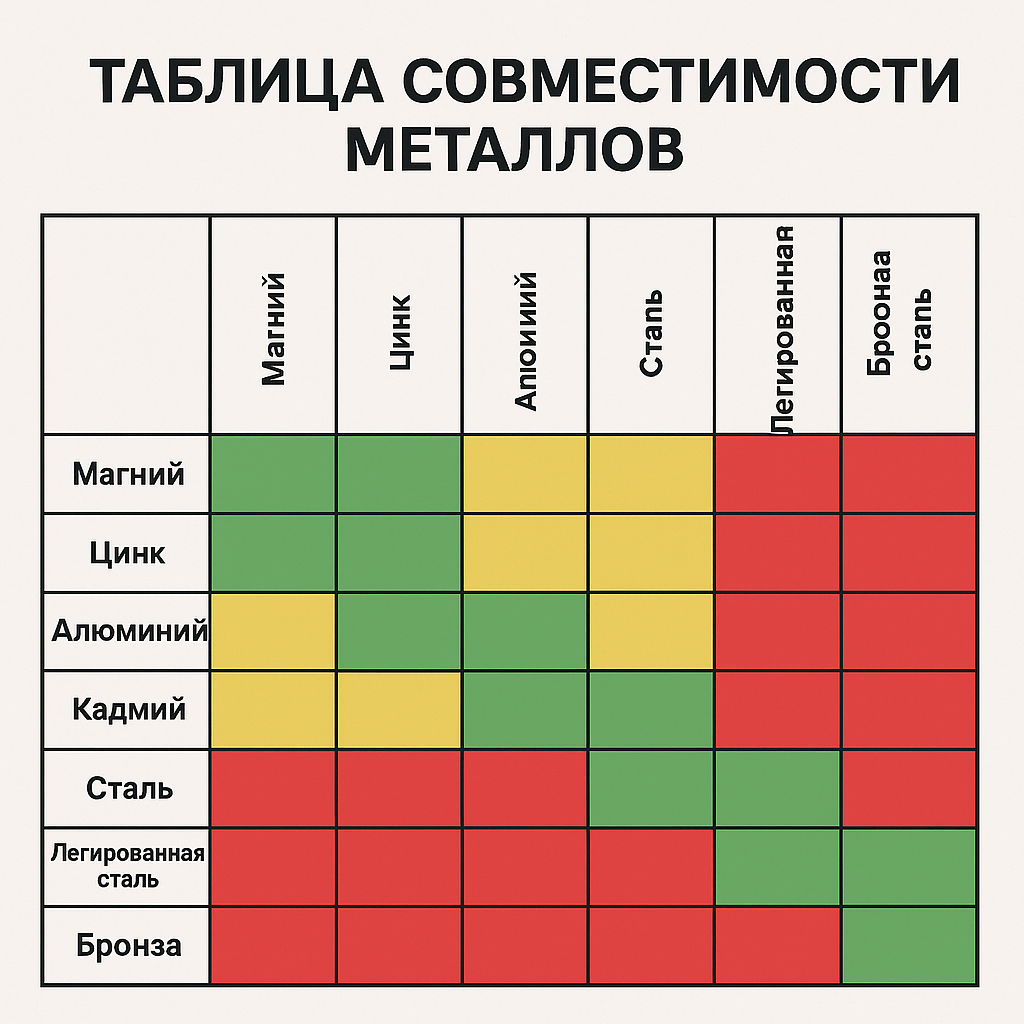 | Алюминий – Цинк | ✅ Хорошая | Цинк более анодный, алюминий защищён |